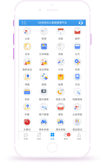 包含用品管理、会议管理、投票管理、车辆管理、固定资产、新闻管理通知公告 、日程查询,满足企业日常办公的需要,界面友好贴合众多用户的使用习惯。