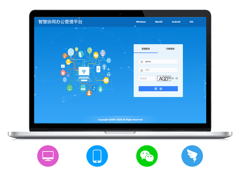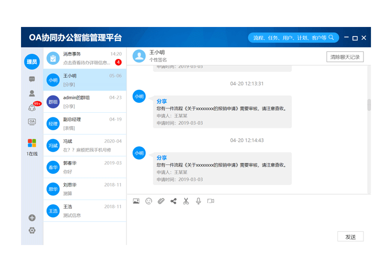 支持Windows和Mac系统,内置OA面板,集成OA菜单;多标签聊天窗口切换,沟通更加高效;可支持使用内网、外网不同网络环境登录,支持建立即时通讯群组、消息和待办事务提醒;实现文件传输、消息记录支持快速查找图片和文件等功能。