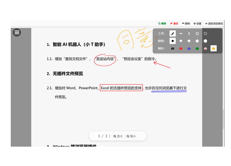 Contact Us全文签批组件依托于YT-DCS服务,把常规的电子文档极速转换为HTML/HTML5网页,在文档在线预览的模式中,提供批注、圈画、签字等功能,审批人员不用下载文档至本地,就可以对文档进行在线签批。不管是电脑端还是移动端,文件都无需落地,也无需安装任何软件,直接在线阅读文件、签批文件,充分满足移动办公的文档处理需求。